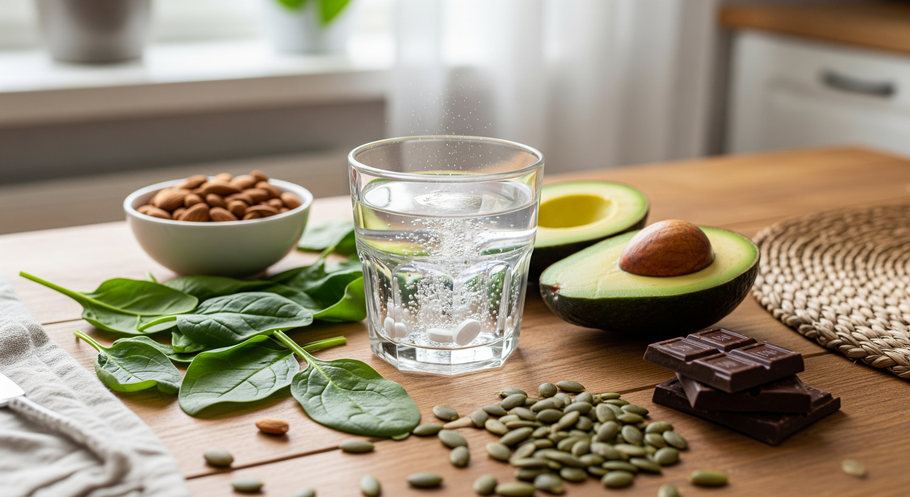 - Asegurar una dieta rica en magnesio: incorporar almendras, espinaca, aguacate, semillas de calabaza y cacao puro.