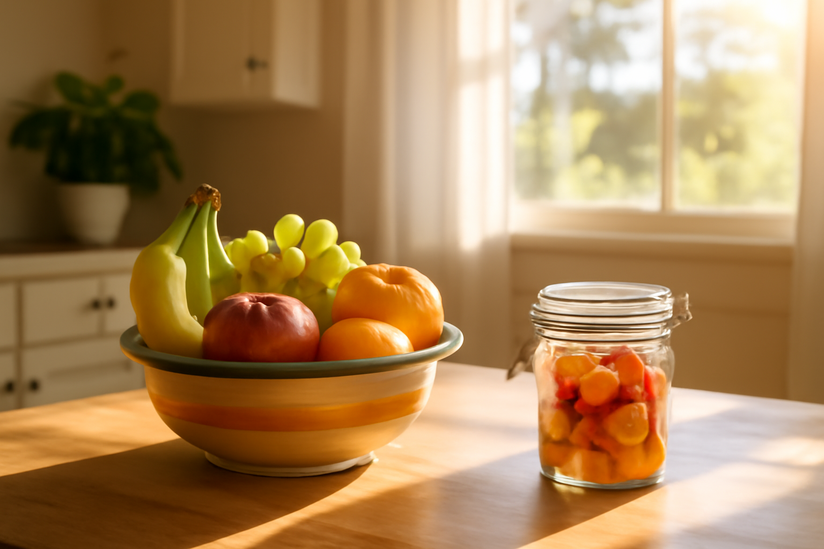 La organización visual puede ayudarte a tomar mejores decisiones. Tener un frutero colorido a la vista en la cocina o en la mesa del comedor aumenta inconscientemente la probabilidad de que elijas una fruta como snack, en vez de opciones menos saludables. Lava, pela y corta frutas de temporada para guardarlas en recipientes herméticos y tenerlas siempre listas.