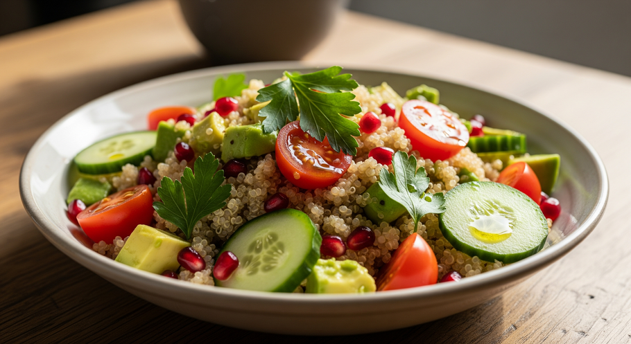 - En un tazón grande, combine la quinua enfriada, el aguacate cortado en cubitos, los tomates cherry, el pepino y las semillas de granada.